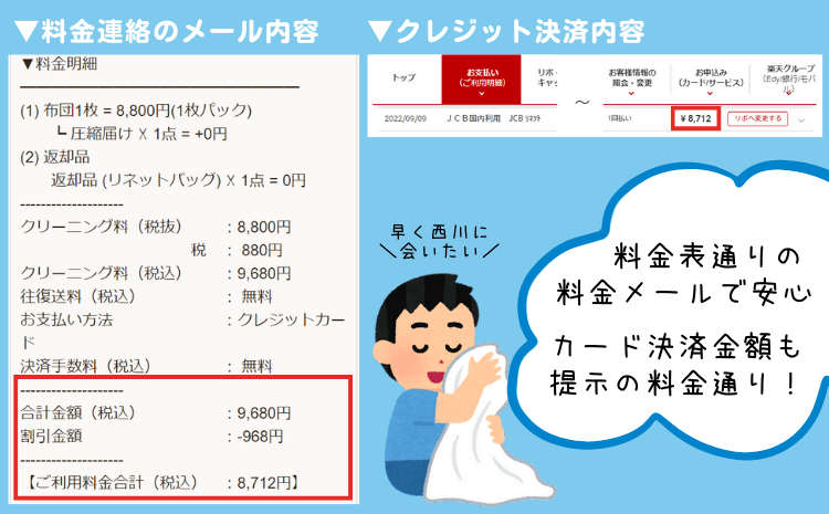 布団を送り、リネットから検品終了・料金連絡のメールが届いた日に決済されます。