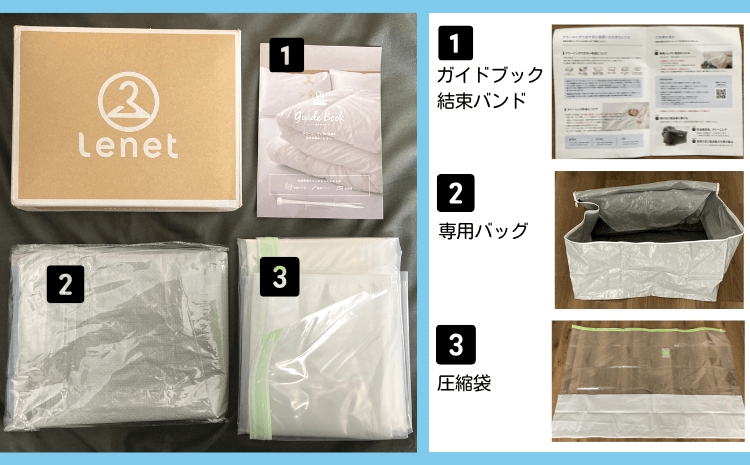 中には①ガイドブック、②専用バッグ、③圧縮袋が入っています。